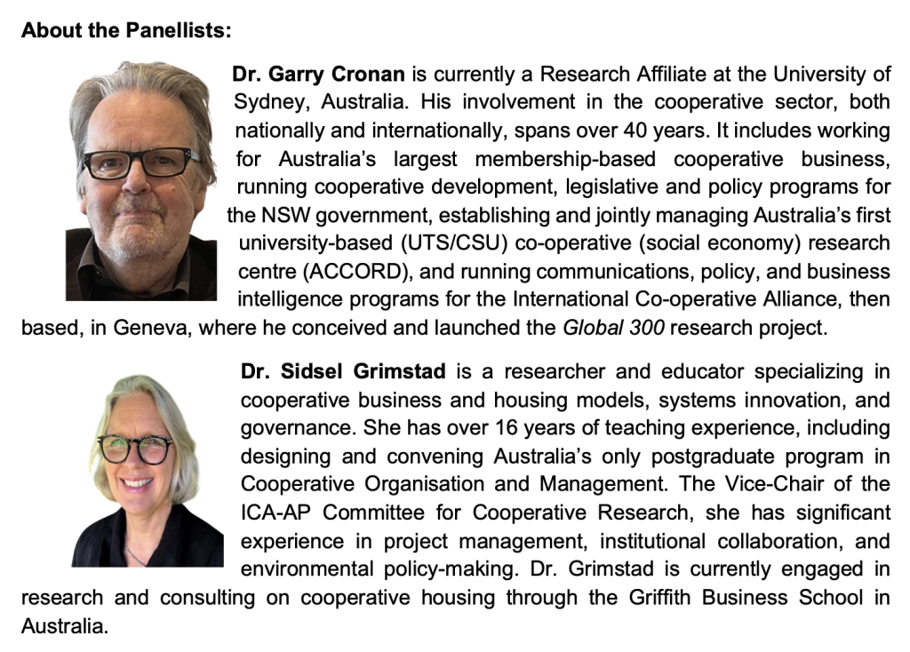 | 30 mins | Comparative Research on Cooperative Case Studies | Dr. Garry Cronan, Research Affiliate, University of Sydney, Australia |